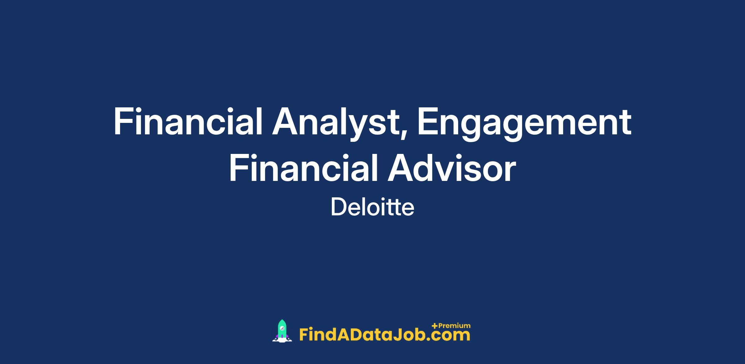 The Engagement Financial Advisor Practice employs a hybrid work model that capitalizes on the benefits of both virtual and in-person experiences by identifying those activities that create the most value for you, your teams, and your clients when performed together in-person. We believe that in-person time is a necessary part of building relationships, facilitating teamwork, and supporting our culture. Currently the ability to travel outside of your Deloitte office location is expected to be 0-10%, on average, based on your client assignments.